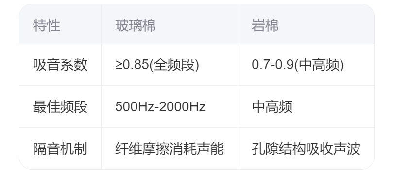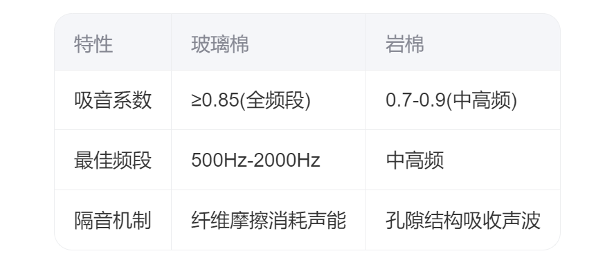 玻璃棉:吸音系数≥0.85(100-5000Hz全频段)在中频段(500Hz-2000Hz)表现尤为出色纤维直径细(5-8微米),形成三维立体多孔结构通过纤维间的摩擦和空气流动阻力消耗声能岩棉:降噪系数0.7-0.9对中高频声波有较好的隔音效果纤维相对粗短,密度通常较高(35-200kg/m³)